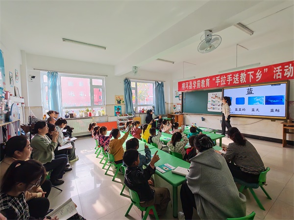 副校长杨春艳带领幼教部送教团队先后来到了孤山子镇中心小学幼儿园与驼腰岭镇学校幼儿园。围绕本年度全县幼儿园教研重点任务,送教活动聚焦语言领域教学内容,两位县级骨干教师隋芳毅和蔡虹精心准备了两节教学活动。第一节教学活动,隋芳毅老师为乡镇孩子们带来了大班语言教学活动儿歌《色彩谣》。她以“魔法瓶的颜色惊喜”情境导入,引导幼儿在“红、黄、蓝”三原色的实验操作中感知色彩变化。通过亲眼观看、亲自操作,孩子们体验了色彩变化的奇妙,色彩变化带来新的美感。利用多形式朗读、认读及结合生活经验进行儿歌创编。孩子们在“做中感知、读中积累、编中创造”,语言理解与表达能力得到有效提升。生动有趣的互动游戏与精美教具深深吸引了孩子们的目光,课堂氛围由最初的羞涩转为踊跃参与。第二节教学活动,蔡虹老师组织的大班语言活动《秋娃娃写信》同样精彩,她引导幼儿细致观察画面内容,并运用划读、大小声读、分角色朗读等多种方式,帮助幼儿轻松掌握儿歌内容。教学环节设计巧妙,现场观摩教师纷纷表示赞叹。课后研讨环节中,城乡教师围绕课程设计理念、教学策略及儿童观、教育观等话题展开深入交流。幼教部王主任对活动进行了总结点评,希望大家以此次活动为契机,推动交流常态化,切实为促进教育均衡发展贡献力量。参与活动的教师表示,本次活动让他们直观感受到“以儿童为中心”的教育实践魅力,受益匪浅。